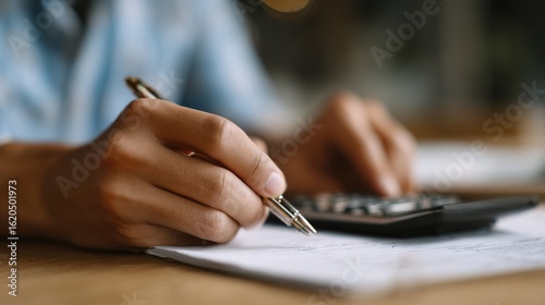 Calculating Finances: A close-up captures hands meticulously calculating and writing on paper at a table, focused on finances and figures, illustrating the essential nature of accounting.