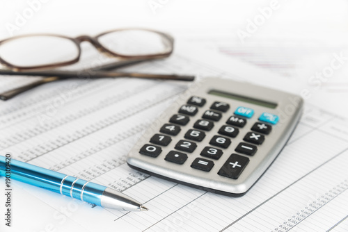 calculator, pen and glasses on a printed financial report with number tables, business concept for finance, economy and taxes