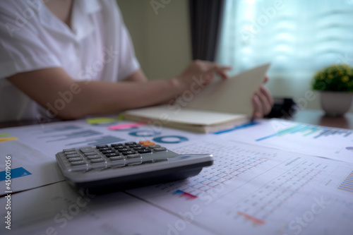 Calculator with background Businesswoman working about tax, accounting, statistics, and analytic research in Bright Modern Office.