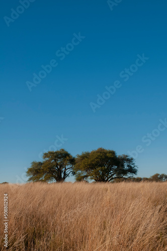 Calden forest landscape, Geoffraea decorticans plants, La Pampa province, Patagonia, Argentina.