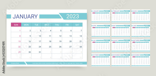 Calendar for 2023 year. Planner template. Week starts Sunday. Monthly calender organizer. Desk schedule grid with 12 month. Corporate yearly diary layout. Horizontal simple agenda. Vector illustration