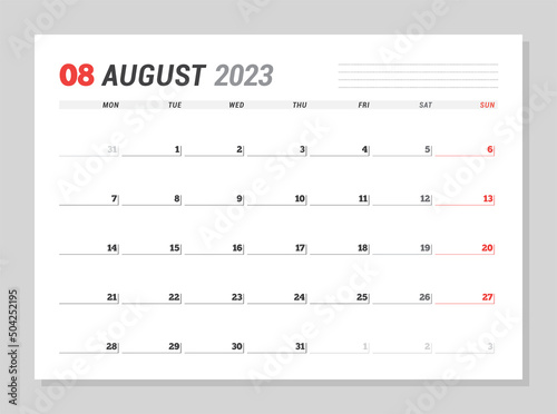 grid, vector, today, paper, month, page, 2023, booklet, plan, weekday, template, schedule, buttons, isolated, printable, white, landscape, desktop, date, season, layout, day, number, style, design, planner, kit, element, stationery, calendar, year, corporate, august, monday, digital, table, business, monthly, organiser, note, new, poster, outline, sunday, week, minimalist, flier, annual
