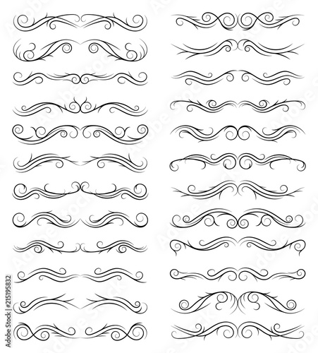 Calligraphic black and elegant swirl dividers collection. Set of curls and scrolls for wall decoration, page decoration, greeting cards and tattoos. Vector calligraphic design elements illustration.