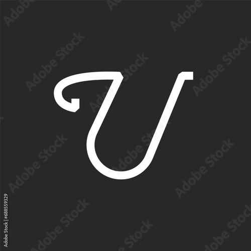 Calligraphic italic font letter U logo monogram creative artwork design, handwritten cursive artistic letter with smooth elegant white art line on black background.