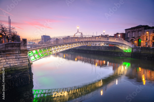 dublin, ireland, bridge, penny, sunset, historic, famous, dusk, city, old, water, river, travel, street, architecture, tour tourism, reflections, urban, landmark, european, footbridge, irish, city landscape
