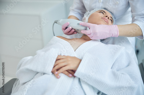 cosmetic, decollete, adult, indoor, procedure, qualified, ultrasound, lifting, robe, skincare, lifestyle, volume, apparatus, care, caucasian, aesthetic, equipment, woman, concentration, rejuvenation, tool, inside, beauty, low angle, modern, white, neck, lady, health, body, skin, cosmetology, medicals, young, beautician, service, client, cropped, therapy, instrument, cosmetologist, charme, salon, glove, patient, female, clinic, device, treatment