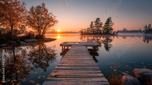 sunrise, lake, dock, autumn, tree, calm, peaceful, morning, gold, water, mist, tranquil, nature, scenic, beauty, outdoors, serene, wood, wooden, pier, fall, foliage, orange, pink, still, quiet, golden hour, fishing, landscape, scenic view, tranquil scene, autumn color, early morning, colours
