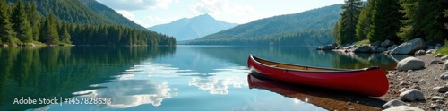 Calm lake, red canoe on rocky shore, pine trees , pine, still