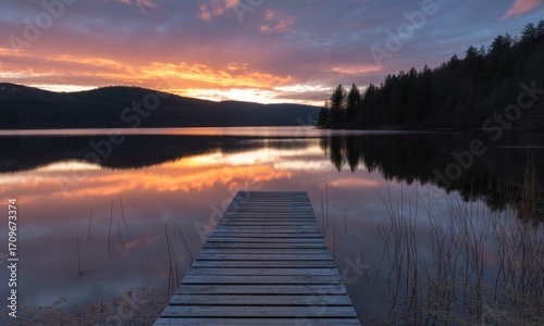 sunset, lake, dock, peaceful, gold, tranquil, serene, nature, forest, tree, water, calm, wood, sky, cloud, orange, pink, purple, blue, horizon, wooden, pier, evening, still, waterfront, landscape, autumn, beauty, scenic, quiet, idylli, exterior, view, stillness, golden hour, vibrant, dramatic