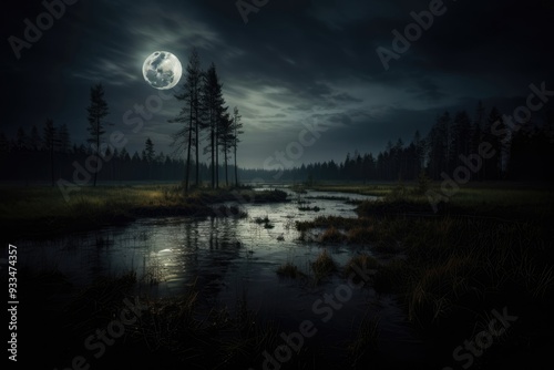 Calm swampy river among old creepy trees in dark forest at night with full moon. Scary Halloween concept. Dark and mysterious background for banner, poster, wallpaper