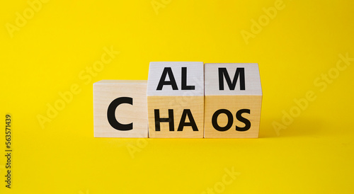 Calm vs chaos symbol. Turned wooden cubes with words Chaos and Calm. Beautiful yellow background. Business and Calm vs chaos concept. Copy space.