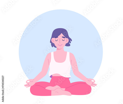 Calm woman practicing meditation for mental health. Yoga for self-awareness and peaceful mind. Flat vector illustration.