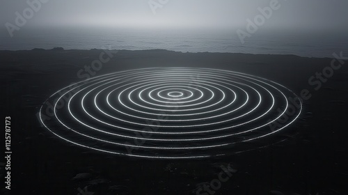 Calming abstract circles serene coastal setting minimalist art display tranquil environment aerial perspective zen concept for mindfulness