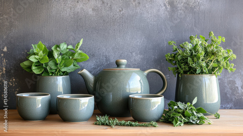 calming herbal tea setup featuring teapot, cups, and fresh herbs in green ceramic containers, creating serene atmosphere perfect for relaxation and enjoyment