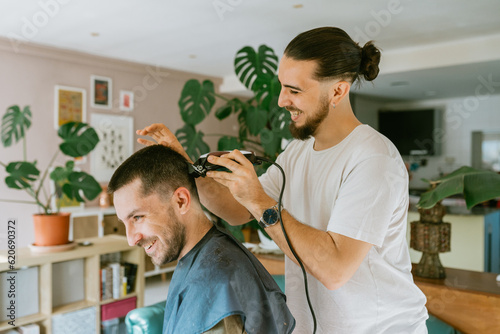 home, barber, camaraderie, clipper, convenience, detail, bricolage, expertise, friendship, fun, grooming, hair care, haircut, hairstylist, home, inside, laughing, laughter, living room, male, precision, professional, scissors, skill, style, technique, togetherness, tool, transformation