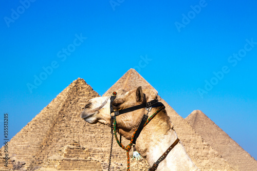 Camel in the desert at the Great Pyramid of Giza, UNESCO World Heritage site, Cairo, Egypt.