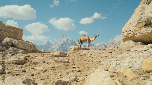 camel, mountain, landscape, sky, sun, desert, rock, stone, dune, horizon, cloud, arid, terrain, scenic, view, nature, wildlife, animal, mammal, travel, adventure, exploration, summer, day, light, heat, beauty, immensity, solitude, peace, serenity, freedom, wild, majestic, peak, range, cliff, boulder, sand, ground, earth