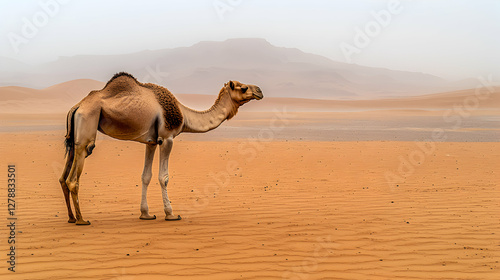 Camel Standing in Sandy Desert Landscape with Mountains in the Background