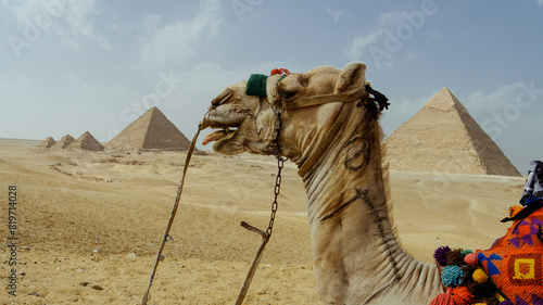 Camel sticking its tongue out, in front of the Pyramids of Giza, Egypt