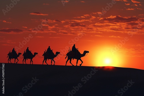 Camels carry travelers across sand dunes at sunset in a desert landscape