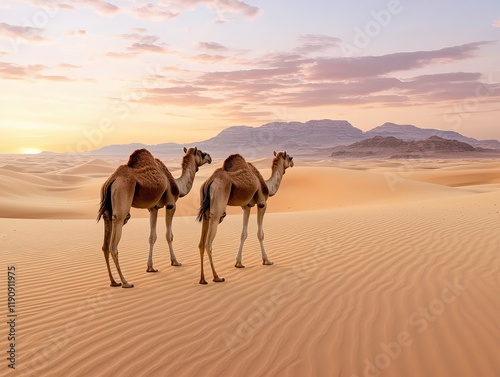 Camels Standing on Shimmering Sand Dunes During Sunrise in Vast Desert Landscape with Mountains in the Background