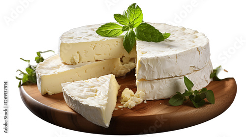 Camembert Cheese Slices Creamy Gourmet Cheese, Mint Herb Display on Wooden Board, isolated on transparent background.