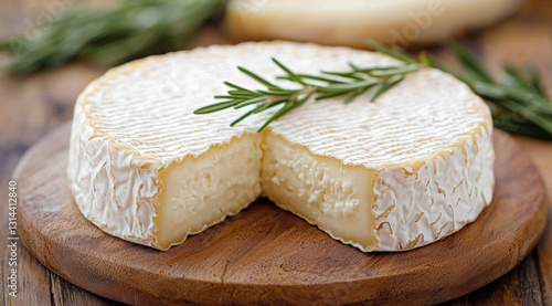 Camembert crémeux entamé sur planche en bois avec brin de romarin décoratif