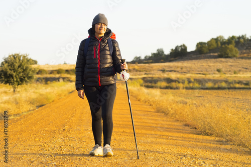 Camino de Santiago pilgrim woman walking to Compostela near Astorga , Leon , Spain