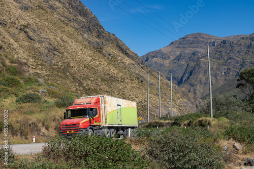 Camiones de transporte pesado recorriendo la carretera de Lima a Canta en los andes peruanos en un día soleado