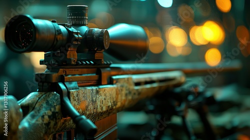 rifle, gun, sharpshooter, weapon, scope, camouflage, military, firearm, shooting, precision, aim, target, hunting, outdoors, equipment, tactical, sport, competition, bokeh, blurry, light, city, urban, night, sharpened, accuracy, optic, powerful, zoom, sight, munition, steel, metal, trigger, barrel, stock, cartridge, velocity, ballistic, range, bullet, action, defense, protection, security, vigilant, watchful