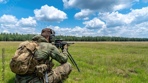 soldier, sharpshooter, rifle, scope, camouflage, military, army, weapon, firearm, field, grass, outdoors, nature, sky, cloud, summer, day, sunny, shooting, target, precision, accuracy, training, combat, tactical, gear, backpack, earphones, ear, protection, prone, position, aiming, sight, sharpened, concentration, landscape, tree, forest, horizon, green, blue, white
