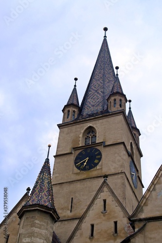 Campanario de la catedral luterana de Santa María en Sibiu, Rumanía.