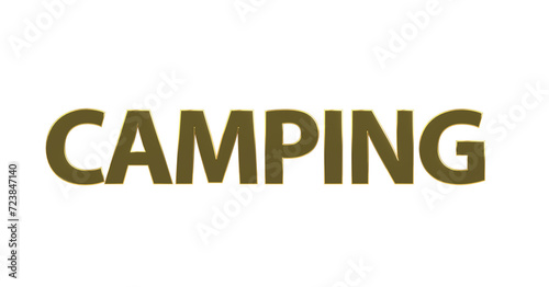 Camping, goldene plakative 3D-Schrift, Reisen, Urlaub, Zelten, Natur, Outdoor, Campingplatz, Ausrüstung, Caravan, Campingzelte, Lagerfeuer, Rendering, Freisteller