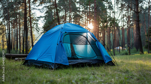 Camping tent set up on a grassy campsite in a green forest. The surroundings filled with green trees and grass create the perfect setting for outdoor relaxation during your holiday trip.