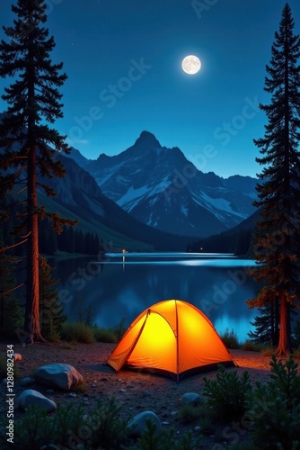 Campsite bathed in moonlight near Stanley Lake, Sawtooth Mountains backdrop , landscape, panorama, night
