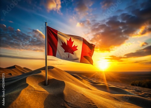 Canadian Flag, Waving, Sandy Dunes, Bokeh, Sunset, Desert Landscape Stock Photo