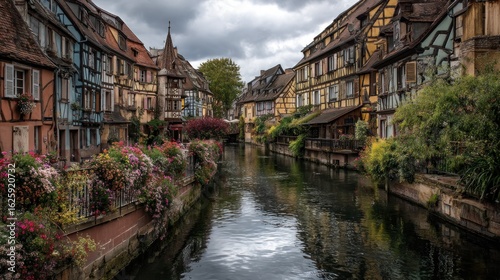 canal, building, town, house, flower, waterway, architecture, european, row house, sky, cloud, tree, plant, colourful, decor, urban, landscape, nature, travel, city, europa, historical, exterior, view, photo, image, photo, commercial, editorial, tour tourism, vintage, classic, beautiful, cosy, daytime, cloudy, calm, residential, street