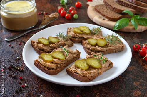 Canapes with chicken liver pate and pickled cucumbers on rye bread. Tasty and healthy appetizer.