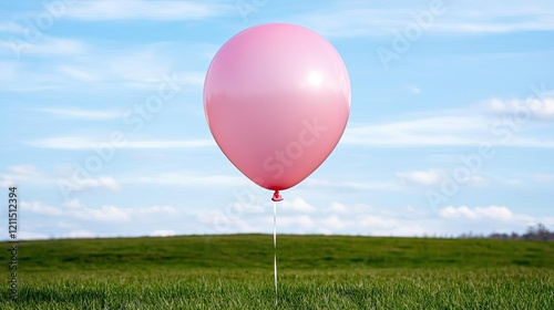 Cancer awareness concept. A single pink balloon floating gently above a green field under a bright blue sky.