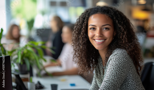 portrait, black woman, smiling, desk, team, tied-up, background, computer, screen, candid, natural light, professional, workplace, collaborative, casual attire, cheerful, productive, diverse, corporate, technology, work, environment, business, teamwork, inclusive, dynamic, professional woman, engaging, relaxed, contemporary, career, leadership, sharpened, vibrant, creative