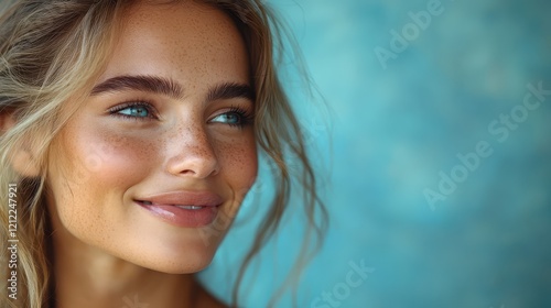 candid, portrait, young, woman, smile, radiant, lighting, blue, natural, beauty, daylight, serene, atmosphere, playful, curl, glowing, skin, relaxed, setting, joyful, expression, confident, happiness, casual attire, soft, sharpened, facial, feature, emotional, warmth, art, aesthetic, charming, high-coloured, refresh, cheerful