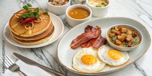 breakfast, food photography, candid, closeup, delicious, food, photo, morning, tasty, healthy, thai food, plate, bowl, spoon, fork, knife, hot drink, tea, juice, fruit, toast, battercake, noodle, rice, egg, bacon, sausage, yogurt, dessert, table, light, natural light, morning meal, asian cuisine, high-quality, realistic, detailed