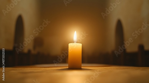 Candle in a dimly lit church – Evoking a sense of peace, reverence, and spirituality, with soft lighting creating a serene and contemplative atmosphere