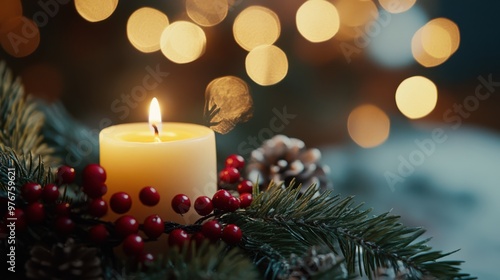 Candle with Holiday Berries and Blurred Background.