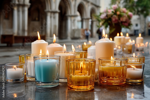 candle, light, glasses, holder, warm, atmosphere, decoration, flames, glow, serenity, peaceful, event, celebration, ambience, wax, colours, soft, illumination, table, arrangement, romantic, flicker, night, ritual, spirituality, design, elegance, calmness, festive