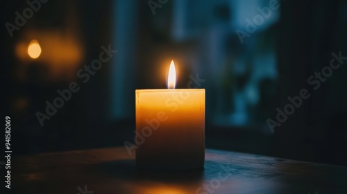 Candlelight Glow: A single, burning candle sits on a wooden surface, bathed in the soft, warm glow of its flame. The blue-toned background creates a sense of peace and tranquility