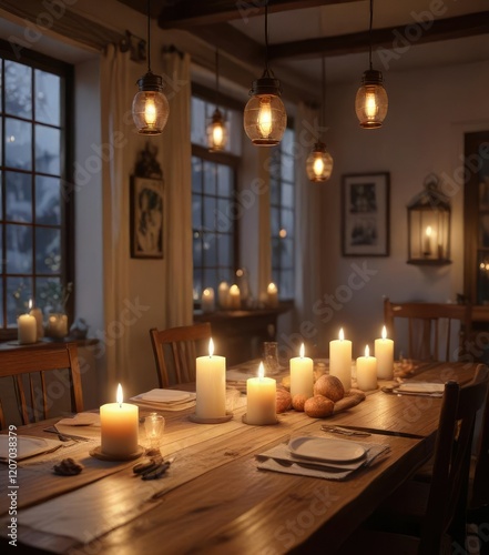 Candles and lanterns illuminating a cozy dining room, inviting space, soft lighting, autumn colors