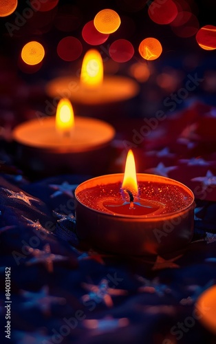 Candles glow on a red, white, and blue fabric with bokeh lights.