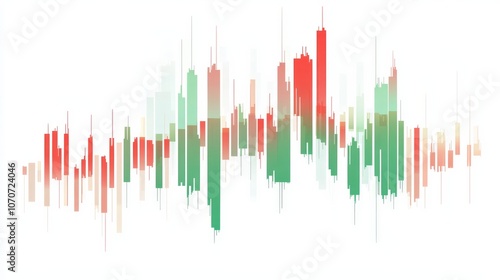 Candlestick stock market chart, green and red, more red, high fluctuation, simple, minimalism white background