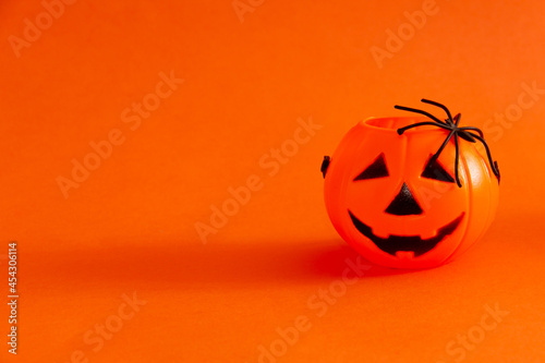 Candy basket in the shape of halloween lantern pumpkin on orange background with a spider. Selective focus. Copy space.